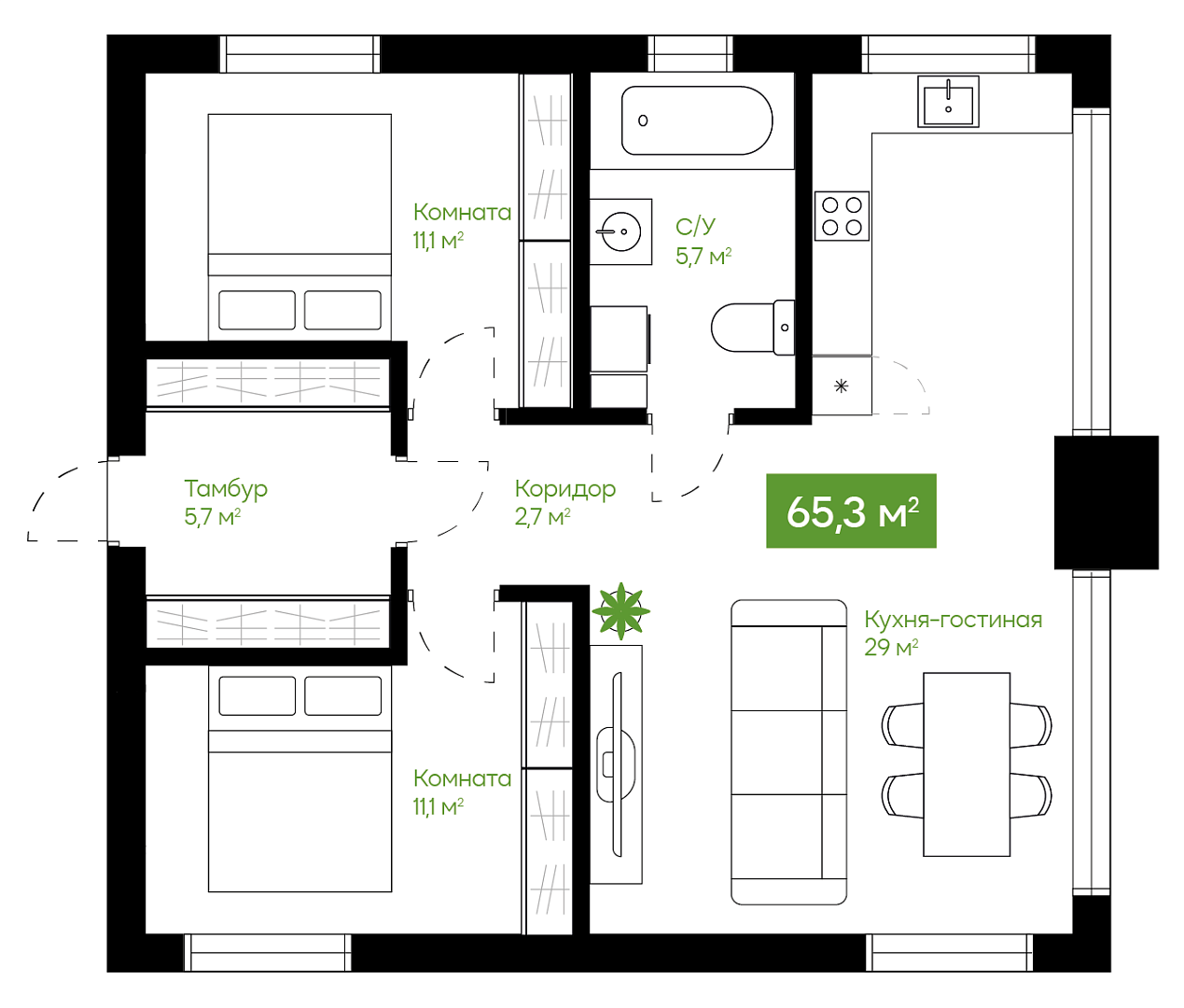 2 спальни Ванная комната с окном Просторная кухня-гостиная Гардеробная