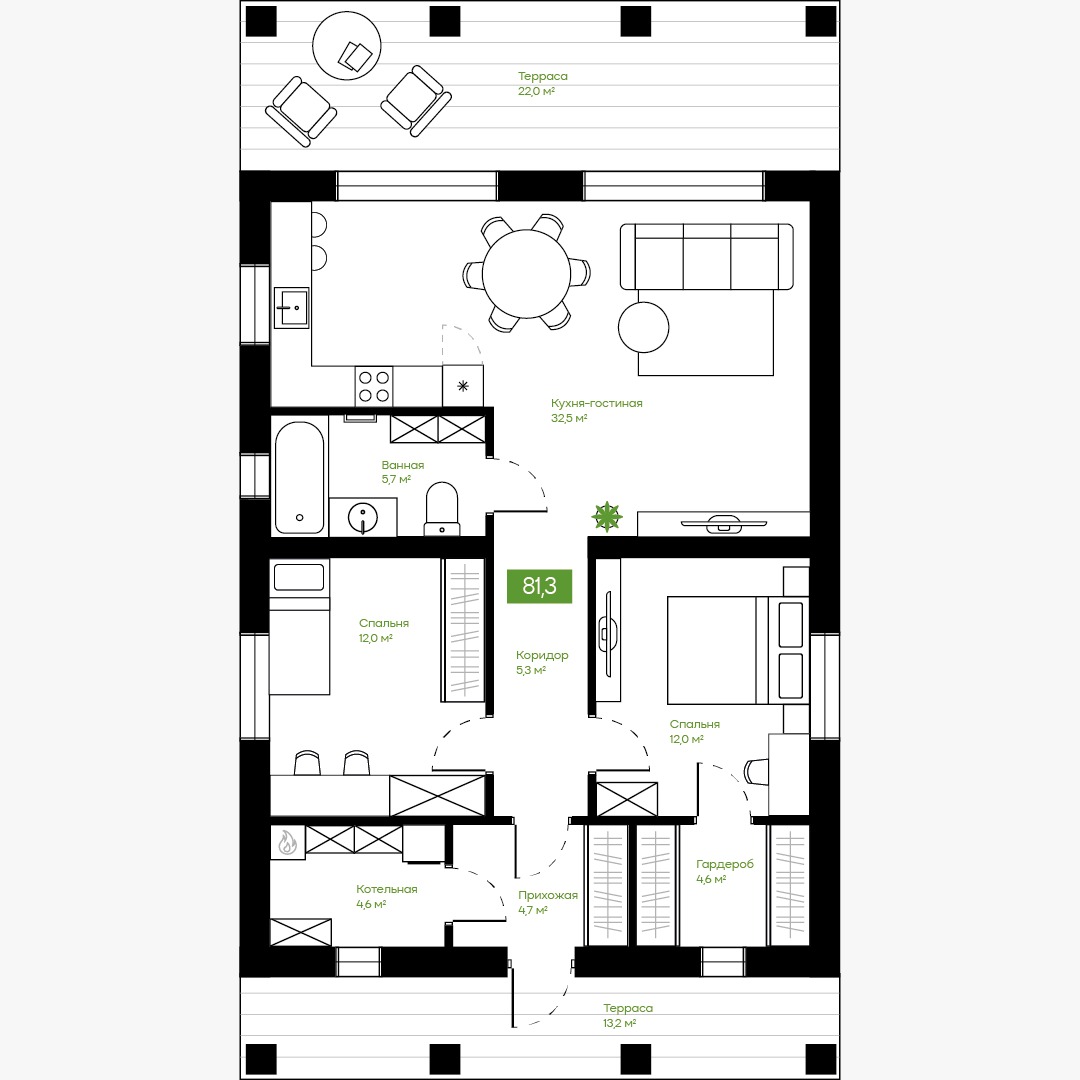 3 спальни 2 санузла Кухня-гостиная Котельная Терраса