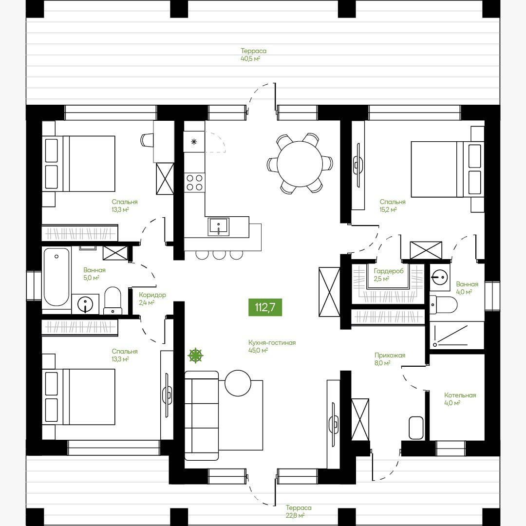 3 спальни 2 санузла Кухня-гостиная Котельная Терраса