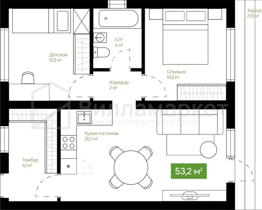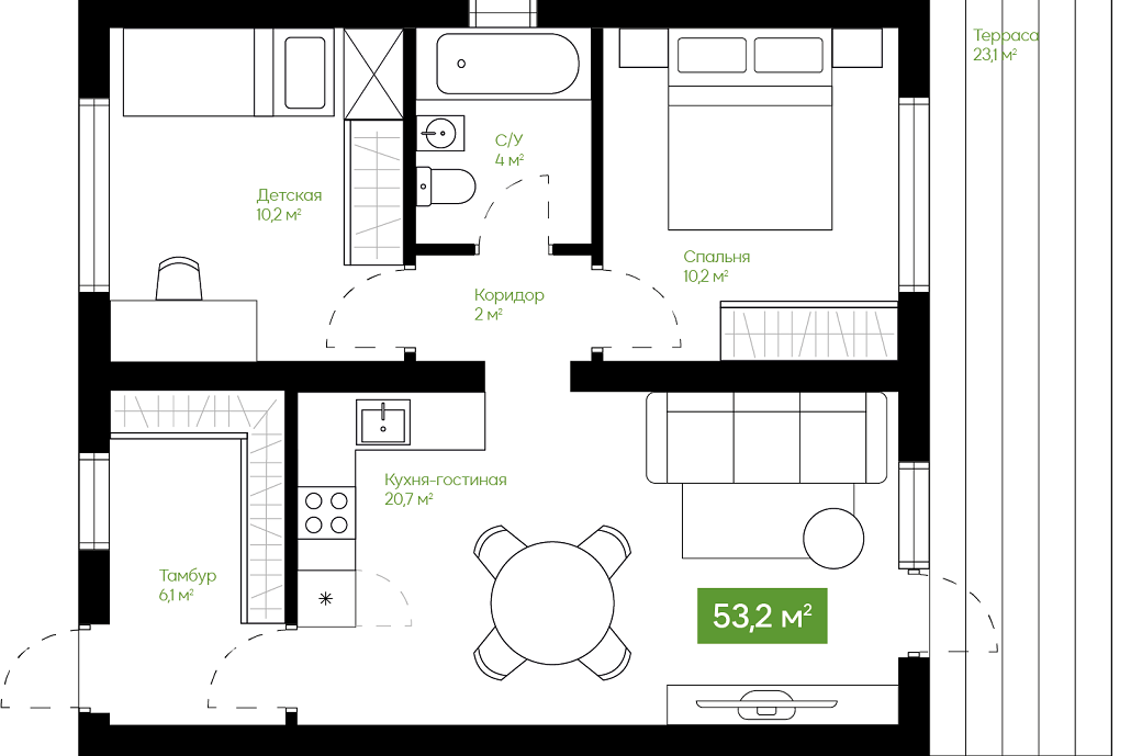 2 спальни Ванная комната с окном Просторная кухня-гостиная Гардеробная