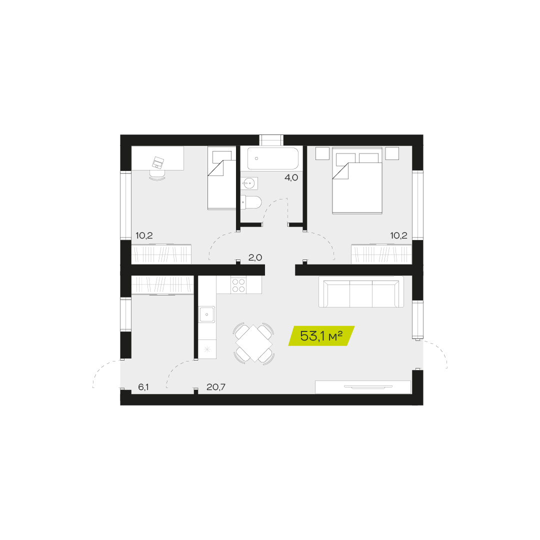 2 спальни Ванная комната с окном Кухня-гостиная с выходом на террасу Гардеробная